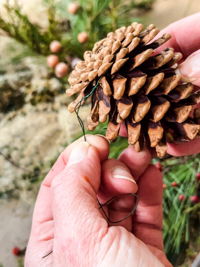 Feel free to hot glue on the pinecones but I attached them with floral wire. To do this first cut a piece of wire that will be long enough to secure to the wreath. Run the wire around the base of the pinecone and twist until the wire is tight.
