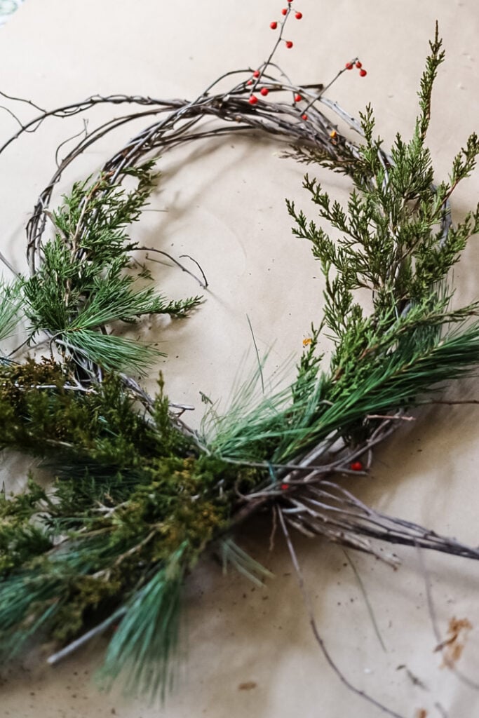 To secure the pine branches all you have to do is insert them between the vines on the wreath.