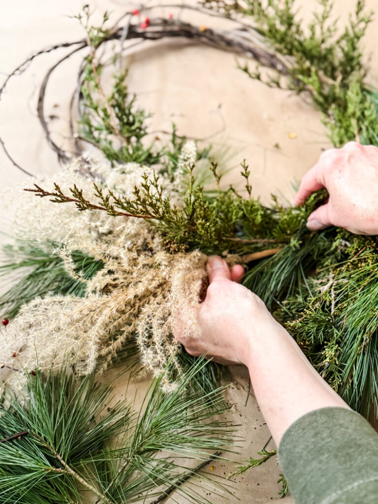 Something unexpected for a winter wreath, I added plumes from an ornamental grass. Not only do they provide a contrasting shade to the wreath, but their free-flowing texture also adds a sense of movement.