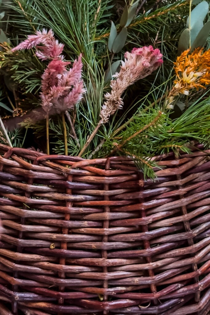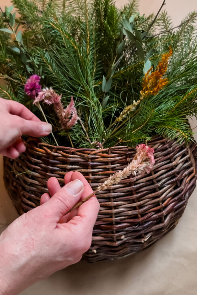 Add clusters of dried flowers to your arrangement. You can place them throughout the basket or create a focal point. For my basket, I added a variety of fuzzy celosia stems that I grew and saved from my flower garden. (see more of my cutting garden)