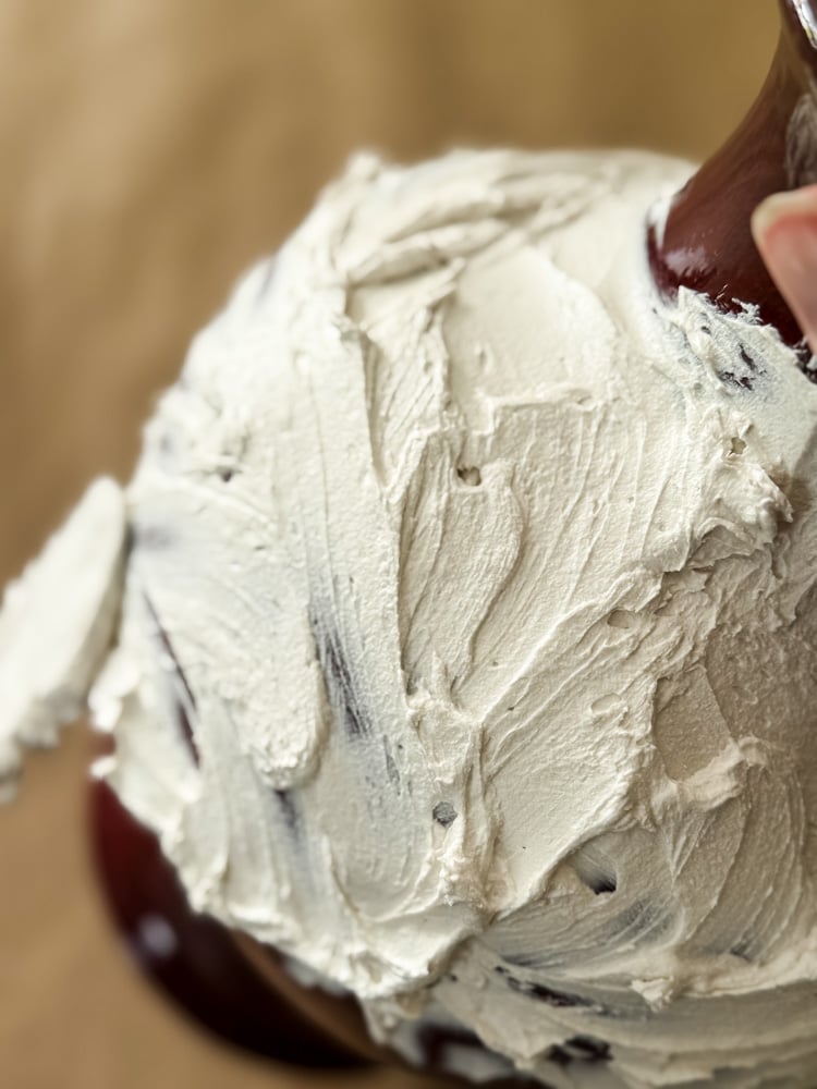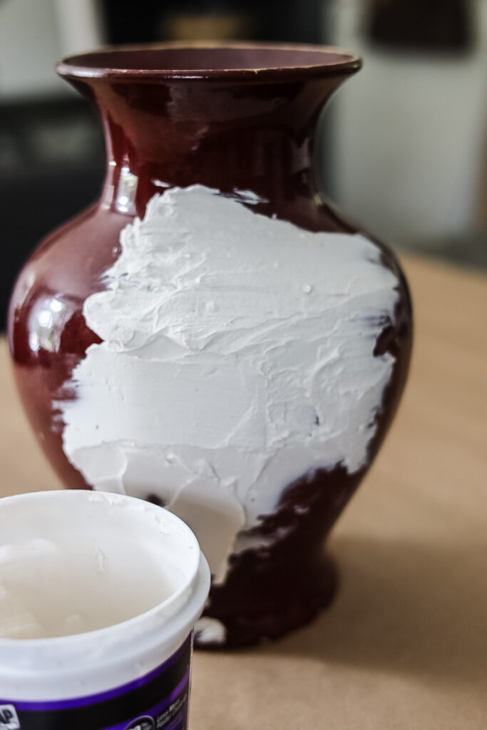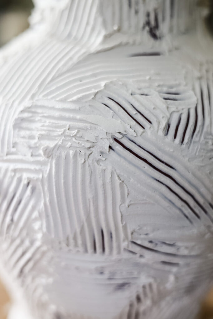 Grab your vase by the unpainted rim (this is your handle!) and start slathering on joint compound like you’re frosting a cake-thick enough to hold texture, but not so heavy it slides.