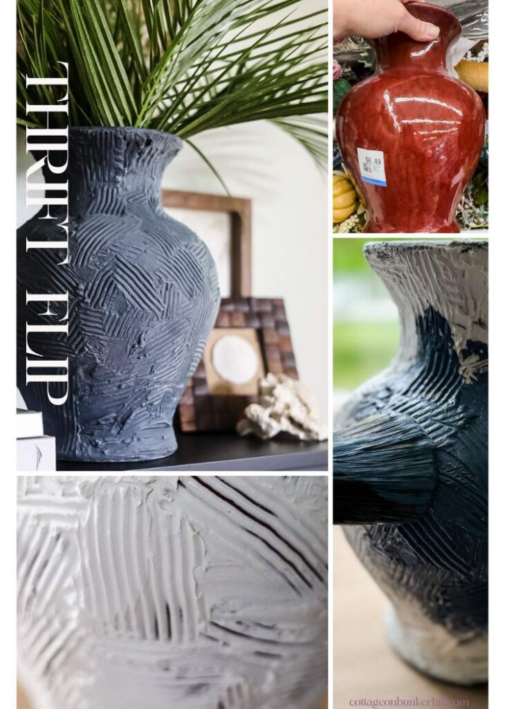 If you’ve followed me for a while, you know I can’t resist scouring the vase section at my local Savers. I’m always hunting for interesting shapes with ‘good bones’ pieces I can transform with a little texture and paint. Lately, I’ve been obsessed with Pottery Barn’s collection (especially that stunning white combed-texture vase!), but with my new blue rug anchoring the living room, I wanted something deeper. Enter: indigo chalk paint, a tub of trusty joint compound, and the cheapest tiling tool from the hardware store. Today, I’m sharing how I created a high-end textured vase for under $16-no pottery wheel required!