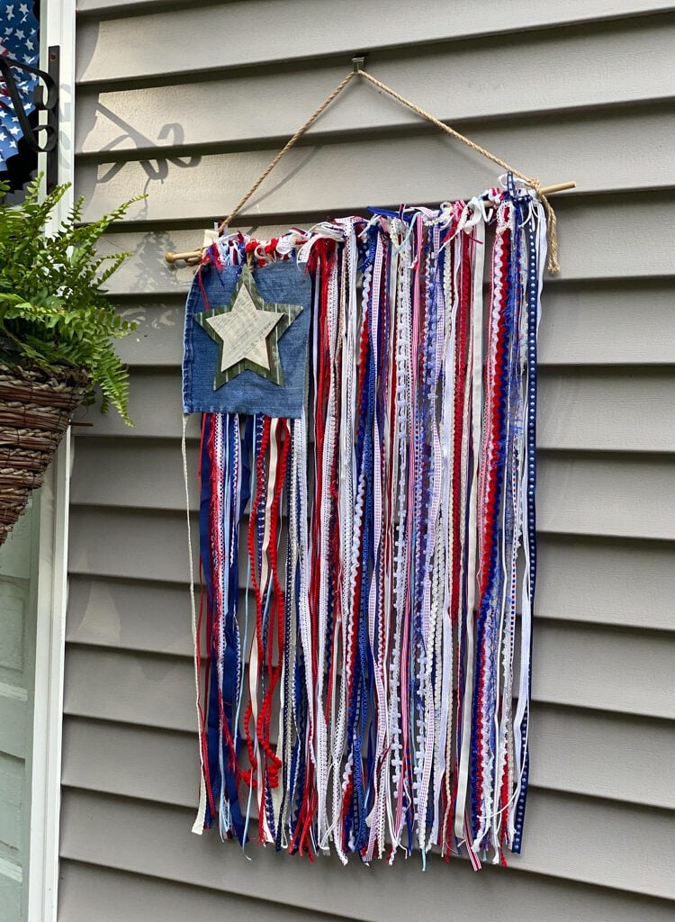And just like that—our rustic ribbon flag is complete! I hung mine on my house using vinyl siding hooks. But this beauty would look equally charming on your front door. I love to see how the ribbons flutter in the breeze!