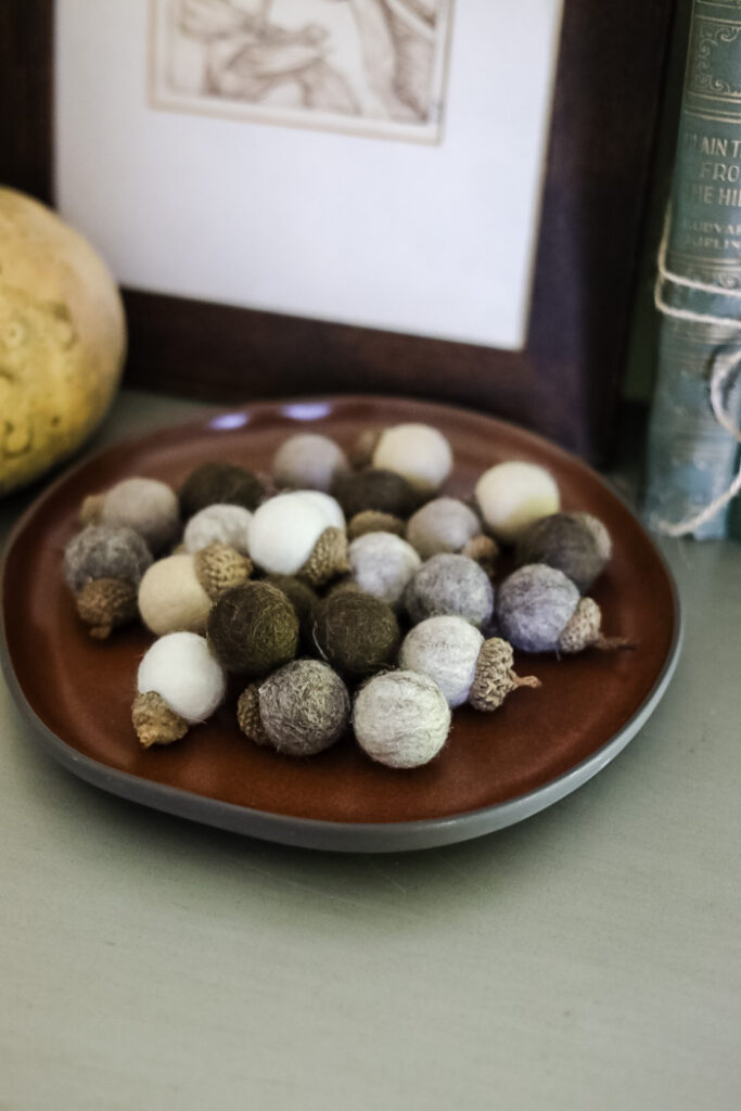 One simple way to use the DIY felt acorns is to simply place them on a table or shelf as a bowl filler. A pretty Fall dish, basket, or urn is a simple Fall decorating idea.