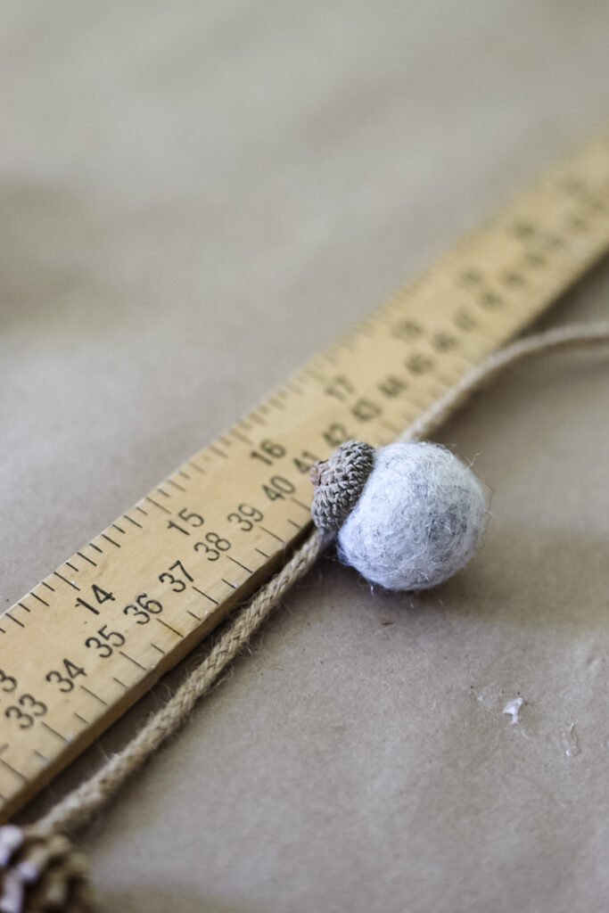 - To make a garland cut a piece of jute twine 6 feet long. Alternate gluing felt acorns and mini pinecones every 10 cm. across the piece of jute.