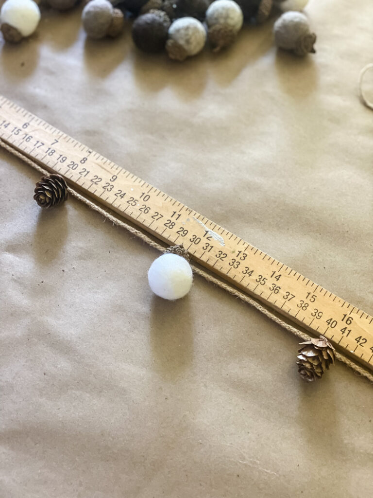 To make it easier for me to keep the acorns and pinecones an even distance from each other, I grabbed a yardstick and put it on my work surface so I could measure.
