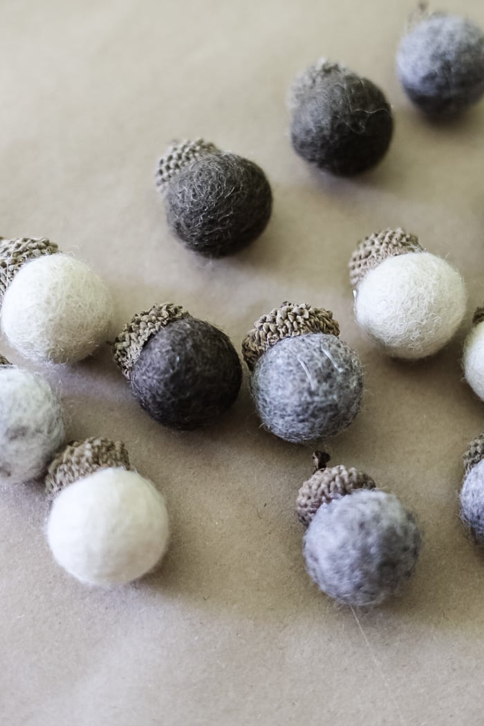 My Fall decorating style is pretty neutral. I tend to use lots of natural elements in my home when I am decorating for Fall. So for my set of felt acorns, I chose a set of neutral-toned felt pom poms with beige, brown, and gray colored balls. This set from Amazon comes with 60 20mm wool felt pom balls and comes in a few different color combos and was around $18 when I bought it.