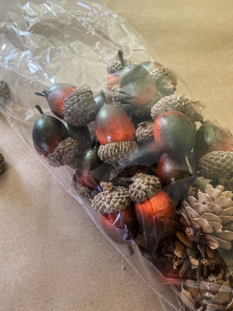 Here are the fake acorns with real acorn caps that I found at Hobby Lobby. Check the size of the acorn caps because they varied greatly from bag to bag; look for the larger-sized ones.