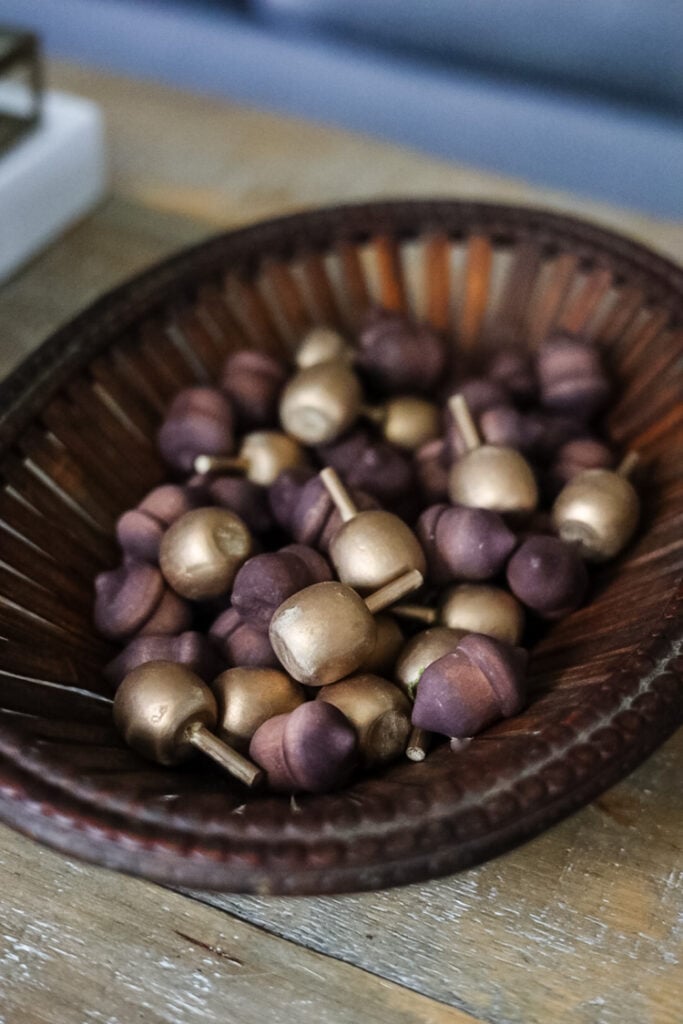 - Organic Accents: A small thrifted rattan basket is filled with DIY wooden acorns (tutorial linked here!), adding a cozy, rustic touch.