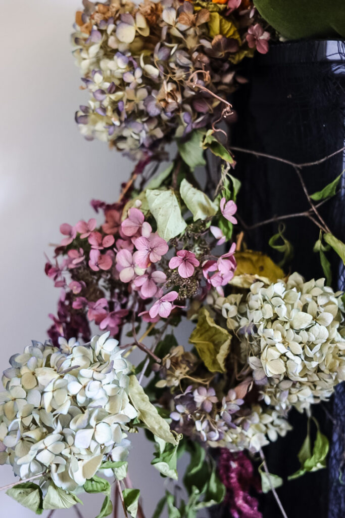 Then added the flowers, starting with hydrangeas for volume. I added different types of hydrangeas: dried ‘Endless Summer’ hydrangeas in a palette of blues and soft greens, and then ‘Little Quick Fire’ panicle hydrangea flower heads that were a soft burgundy. I used floral wire to keep them in place along the grapevines.