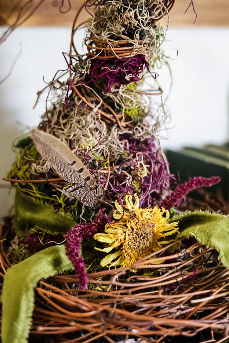 For a touch of elegant whimsy, I tied a green velvet ribbon around the base of the cone. Then, I gently tucked in a small dried sunflower, a few stems of amaranth, and a feather. This gives it that “fresh-picked from a mystical garden” look!