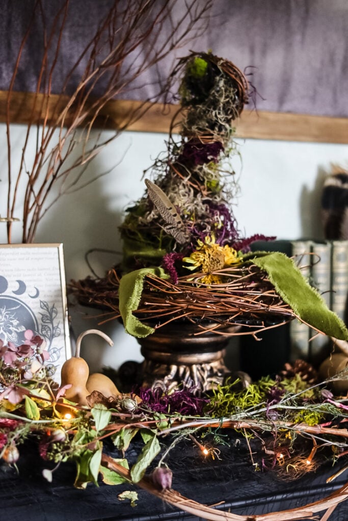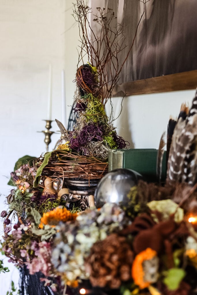 Elevate the Witch Hat: In the center of the mantel, I added the mossy witch hat, but to give it presence and height, I placed it atop a thrifted candle pillar base. This elevates it literally and figuratively, making it a commanding yet graceful focal point.