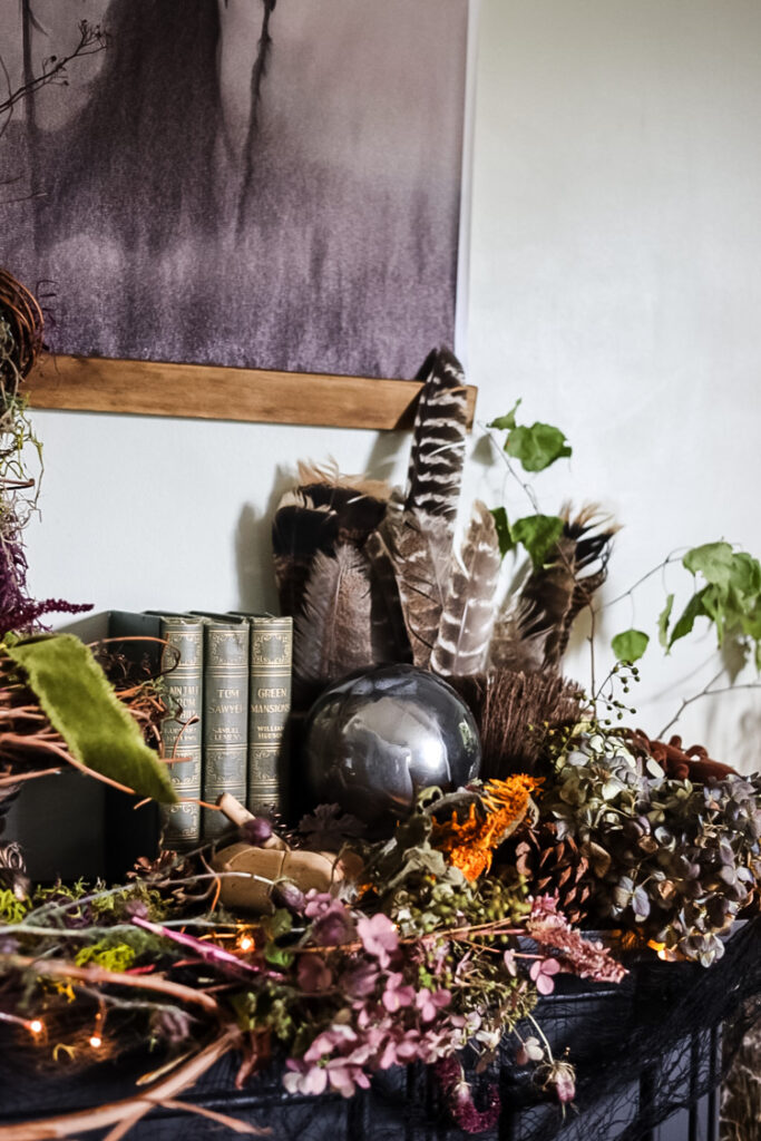 On the right side of the mantel, I created balance by adding a vintage wooden sugar mold filled with wild turkey feathers foraged from the backyard. Right next to it, I stacked a few of my beloved green vintage books to tie in that rich, earthy color palette. In front of this arrangement, I placed the DIY “magic” crystal ball, letting it anchor the scene with its mystical, reflective presence.