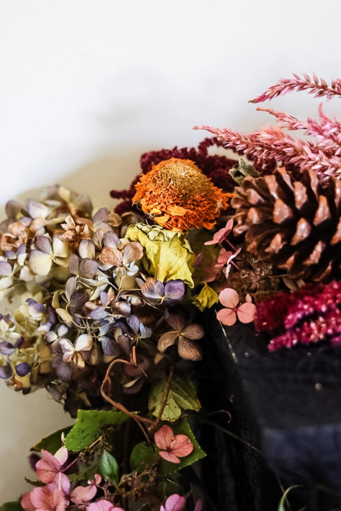 I finished filling in the Fall garland with amaranth for cascading color, sunflowers for cheerful pops, and nigella pods and celosia for texture.