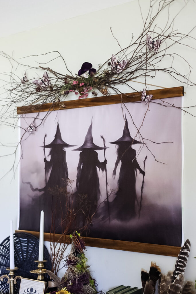 After hanging the art, I created a natural birch twig swag to frame it. I foraged the birch branches and embellished them with dried nigella pods and delicate butterflies (they are from Michael’s Halloween, but I can’t find them online), & clip-on purple velvet mushrooms. I used a monkey hook to hang it above the canvas, letting it arc gracefully above the witch art.