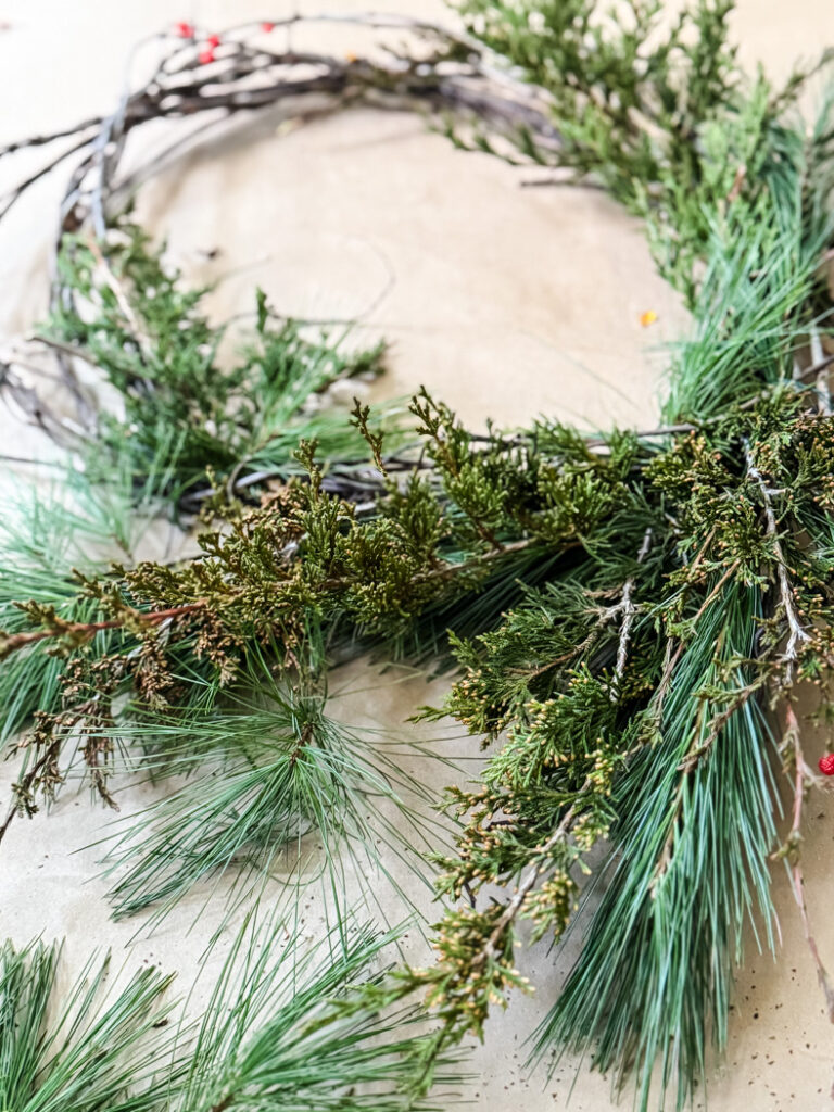 After the pine, I filled the wreath in with juniper branches that have a completely different texture and a deeper green shade.