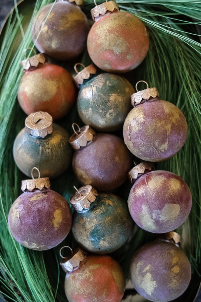 This easy DIY ornament project requires simple craft supplies. Begin with a box of clear plastic (or glass) ornaments, acrylic craft paint in dark colors, baking soda, and gold Rub ‘n Buff. Darker paint colors will yield the best results for this project.