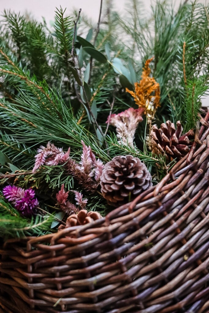 For a natural, wintery feel, add some pinecones to your basket. Wrap a piece of floral wire around the base of each pinecone. Then, wrap the ends of the wire around a greenery branch to secure it in place.