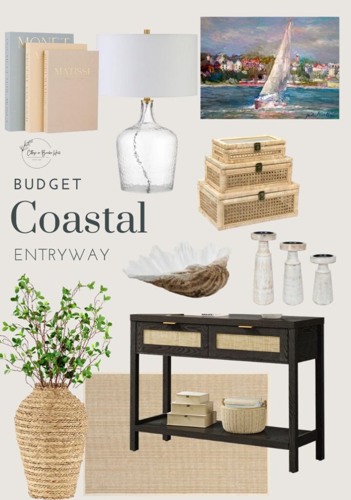 Both the Pottery Barn look and the budget-saving version will bring that casual, coastal feel to your entryway. I love the look of a clear glass table lamp on a console! It instantly makes your space light & airy. Adding a pop of blue with a painting, especially one of sailboats, ties in the coastal feel to this look.