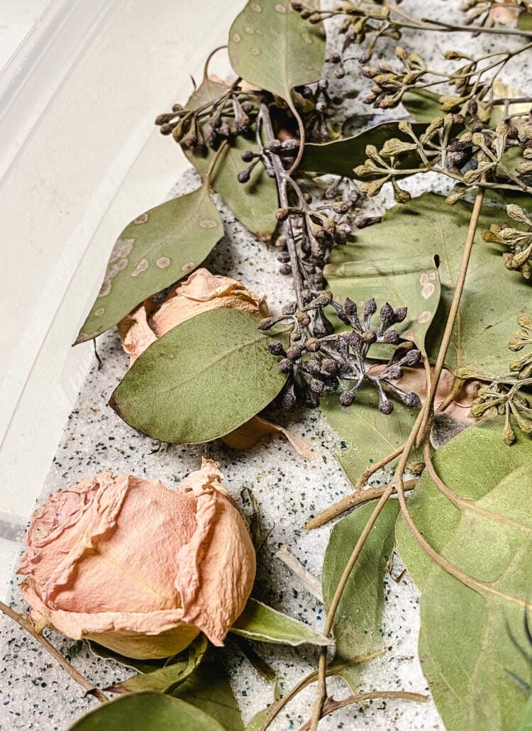 - Place your flowers on top of the silica gel. Gently pour more silica gel over the flowers, making sure they are completely covered.
