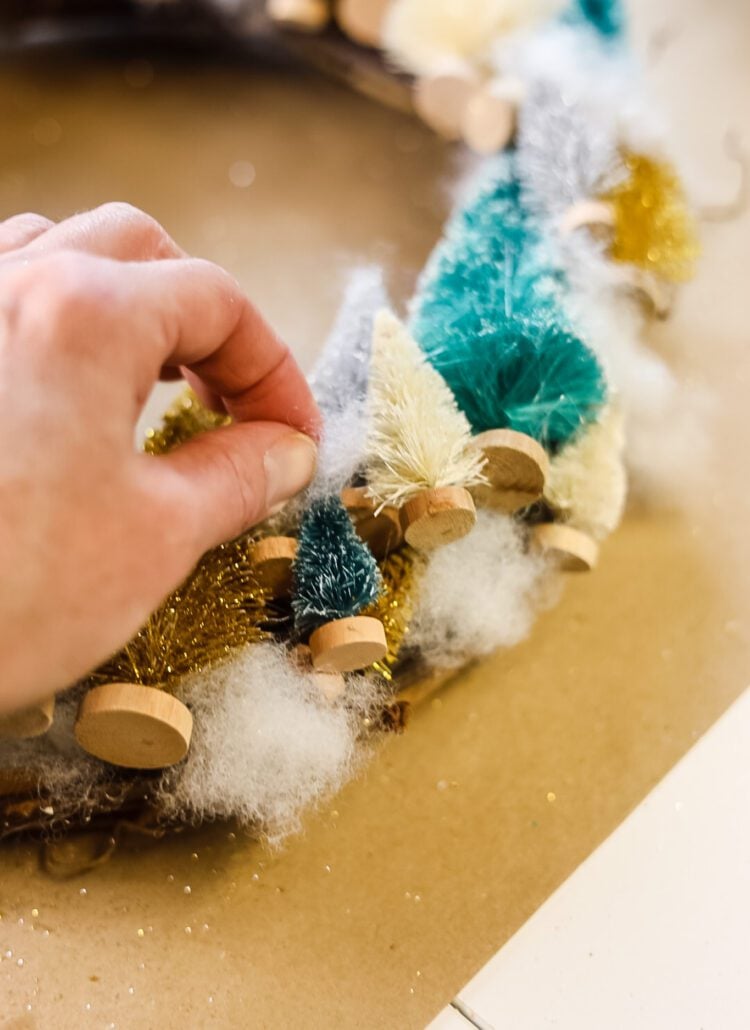 Get your hot glue gun ready because you will need it. All I did was start with one of the largest size trees, put a bead of hot glue down the back and press it onto the wreath. It really didn’t take too much glue to adhere the bottle brush trees to the wreath.