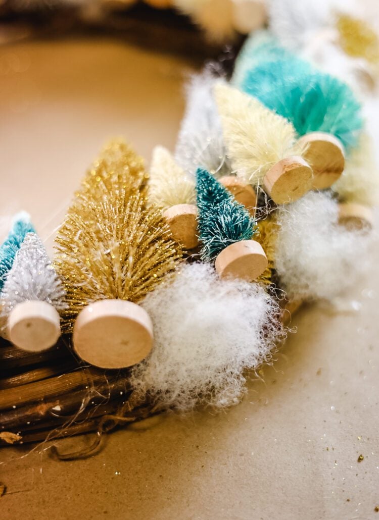 - Once all the bottle brush trees are attached to the wreath add small puffs of polyfill batting to create a snowy effect around the trees and also on the outer and inner surface of the grapevine wreath.