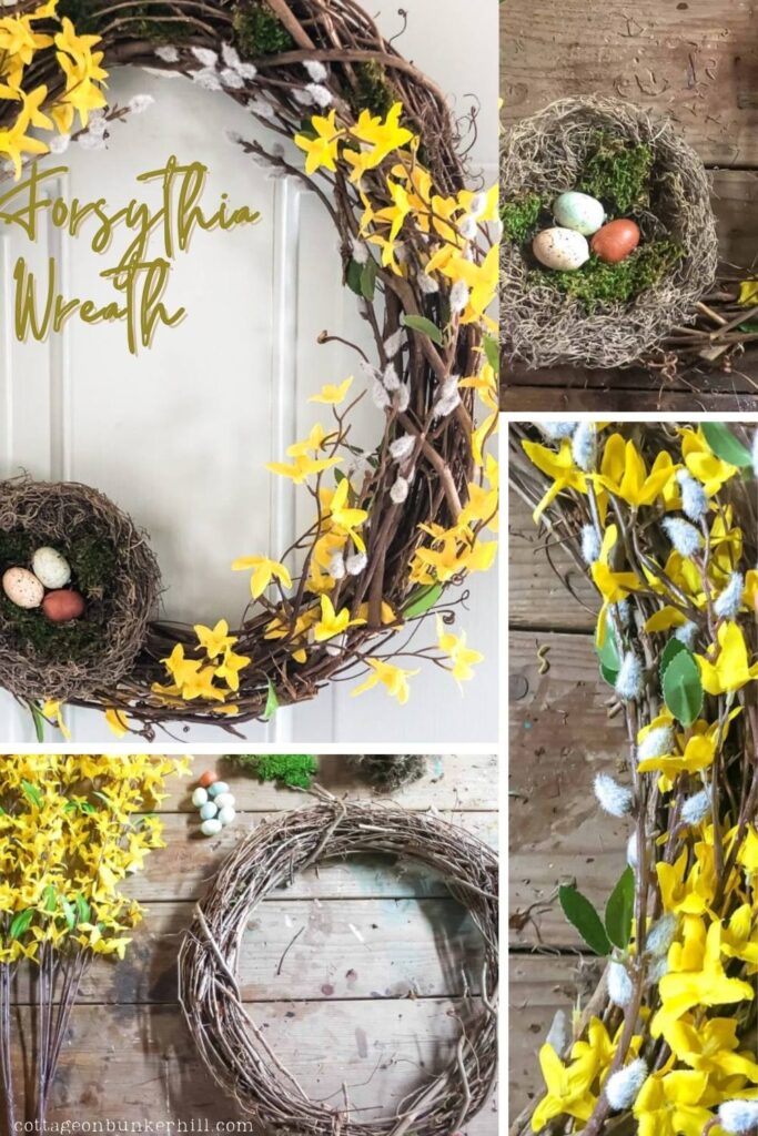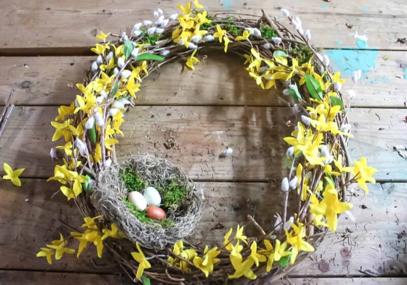 Here’s an easy and quick DIY wreath for Spring that will brighten your day in minutes! Using yellow Forsythia stems and fuzzy pussy willow branches plus I’ll show you a DIY bird’s nest hack to make the most realistic addition to your Spring wreaths!