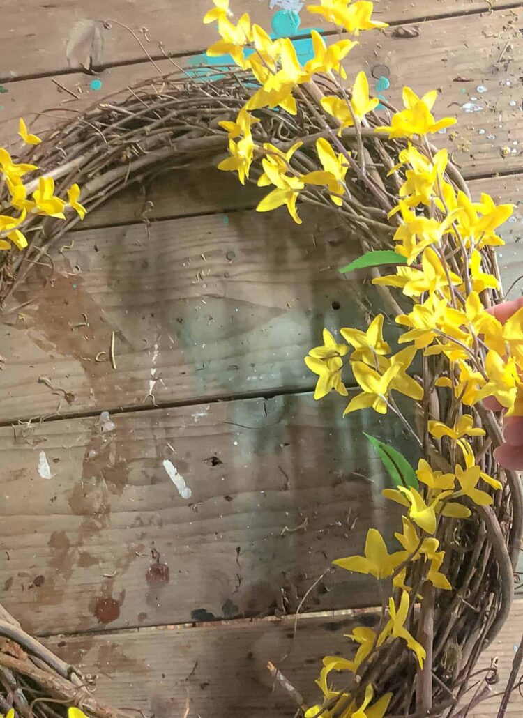 Gently tuck the trimmed stems into the grapevine wreath, bending them to follow the natural curve of the wreath. Take a moment to adjust their placement so they blend seamlessly with the Forsythia.