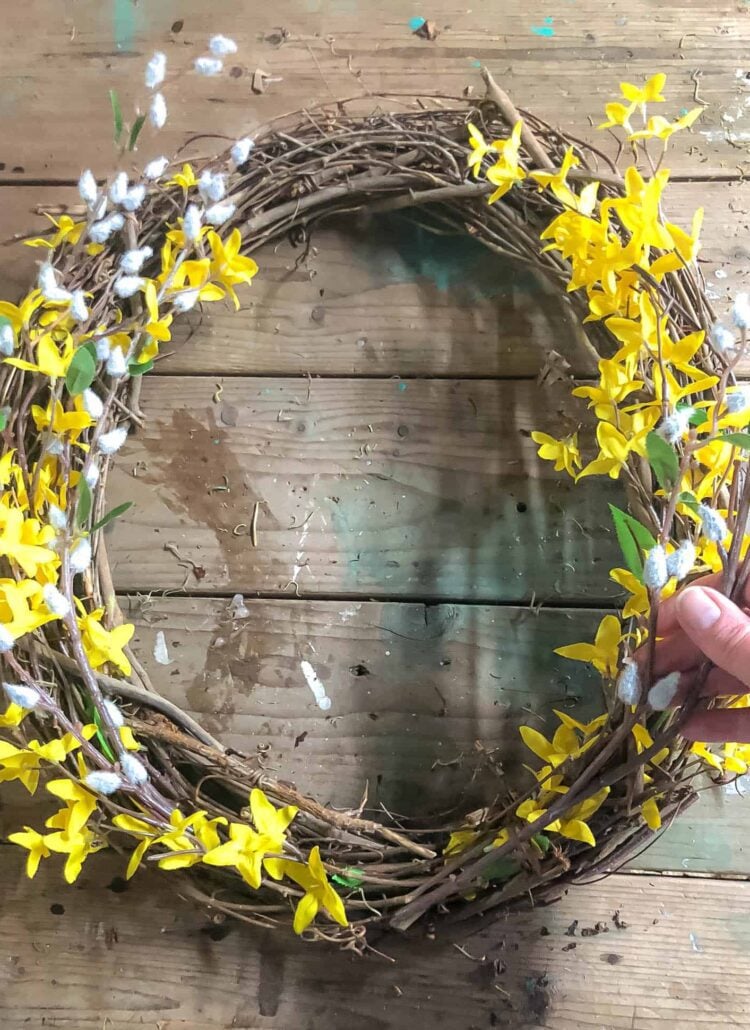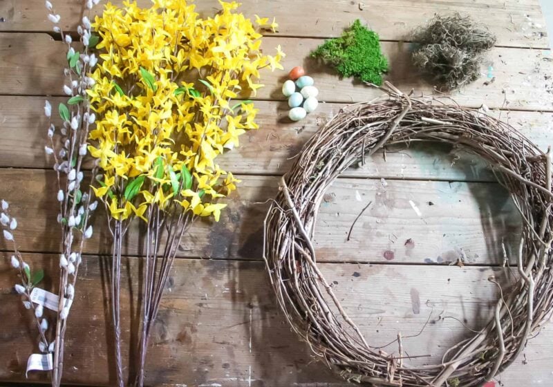 I’m so ready for spring in New Hampshire! Seeing the buds appear on my forsythia bush always feels like a little victory after a long winter. Forsythia is the first to bloom around here, and its bright yellow flowers are the perfect inspiration for a spring wreath.
