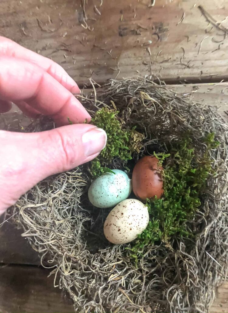 Using my hot glue gun I added 3 tiny eggs and for an added touch I glued on a couple of small pieces of green preserved moss.