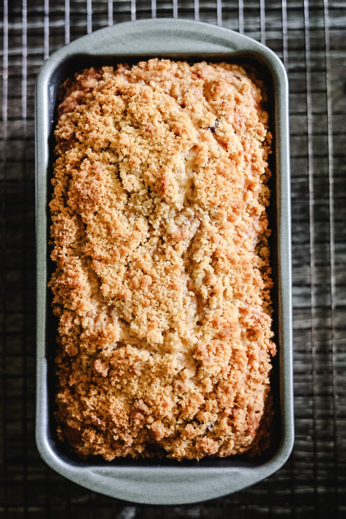 This loaf cake combines the moistness of a classic blueberry loaf with the delightful crunch of a streusel topping. Enjoy!