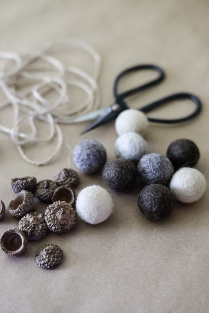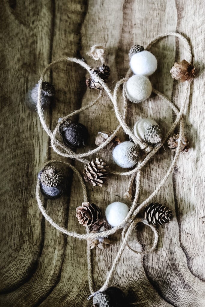 - To make a garland cut a piece of jute twine 6 feet long. Alternate gluing felt acorns and mini pinecones every 10 cm. across the piece of jute.
