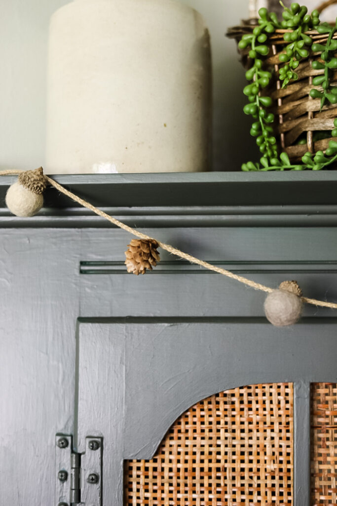 Of course, this would be perfect across a fireplace mantle! If you don’t have a mantle to decorate, then another way to use this is to hang the acorn garland across a cabinet. Like this china hutch in my dining area, it adds the perfect Fall touch to it!