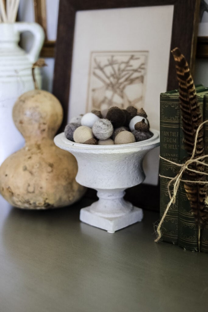 One simple way to use the DIY felt acorns is to simply place them on a table or shelf as a bowl filler. A pretty Fall dish, basket, or urn is a simple Fall decorating idea.