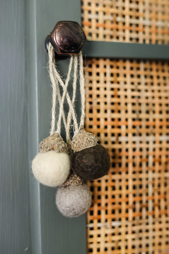 For Fall, a simple look is to hang a few of the felt acorn ornaments off of the handle of a cabinet or hutch. Remember, when you pack away your Fall stuff leave the acorns out and you can add them to your Christmas tree too if you decorate in a neutral style. On my tree, I have lots of handmade ornaments and these will fit in perfectly this year.