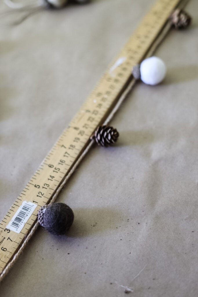 To make it easier for me to keep the acorns and pinecones an even distance from each other, I grabbed a yardstick and put it on my work surface so I could measure.