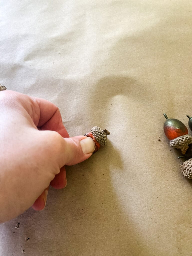 To remove the acorn caps, I used by thumb to squish the foam acorn and then twisted and pulled it away from the cap. It was pretty easy to do! A couple of the acorns didn’t break off completely, but for the most part, the acorn caps made a clean break from the foam acorn.
