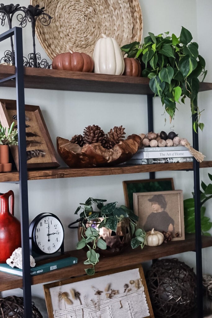 - Lower Level Interest: On the bottom shelf, I placed an ivy plant in a vintage French barrel, letting the vines trail softly. I nestled a few faux pumpkins from my stash alongside it to anchor the display.