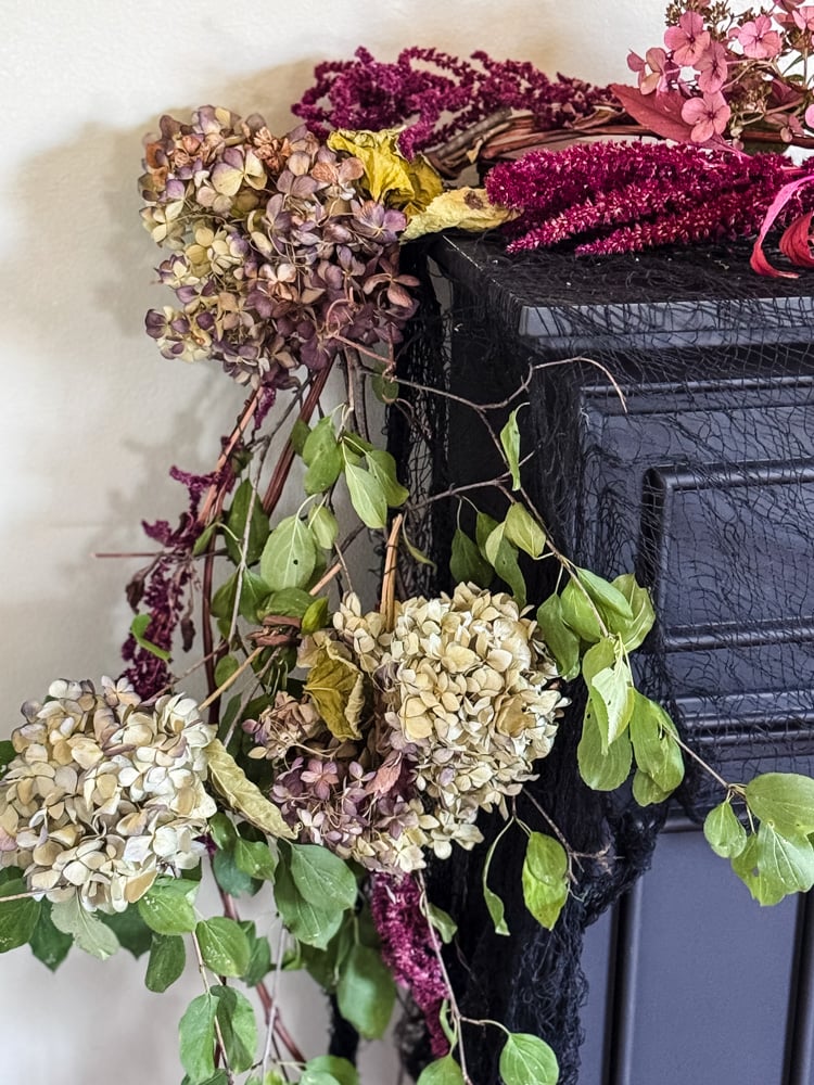 Working in sections, I began tucking and weaving my garden clippings into the grapevine. I started with the leafy branches for structure and greenery. The leaves will naturally dry out, but that will still look perfect on this witchy mantle!