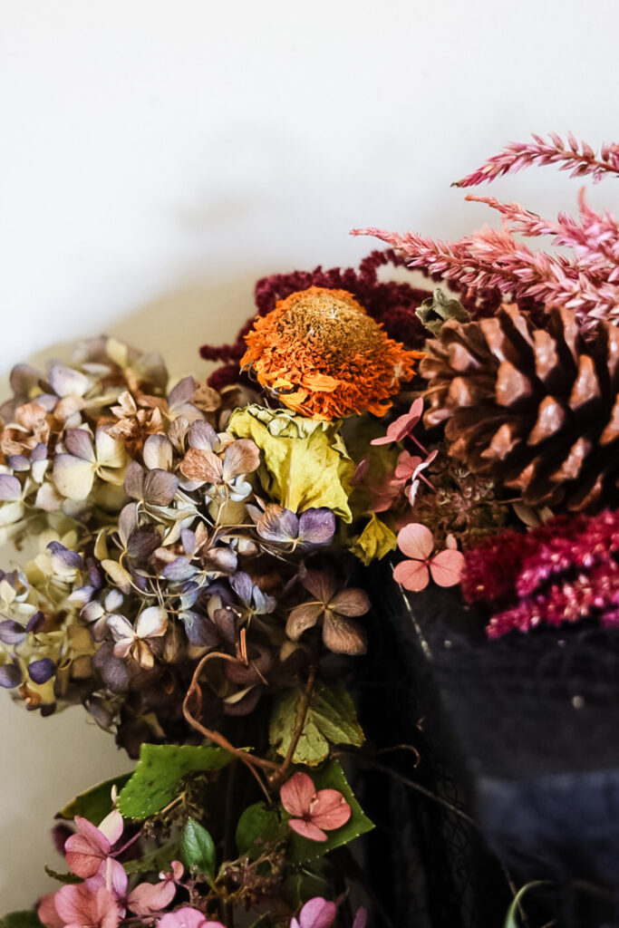 Then added the flowers, starting with hydrangeas for volume. I added different types of hydrangeas: dried ‘Endless Summer’ hydrangeas in a palette of blues and soft greens, and then ‘Little Quick Fire’ panicle hydrangea flower heads that were a soft burgundy. I used floral wire to keep them in place along the grapevines.